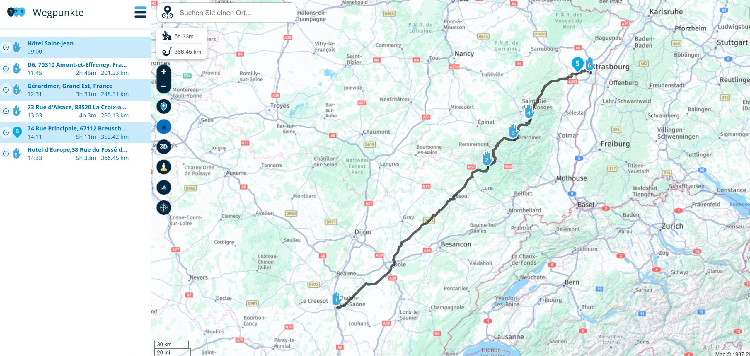 In den Vogesen fahren wir dann einige Pässe, die zwar von der Streckenführung durchaus mit Pässen in den Alpen vergleichbar sind, aber natürlich nicht von der Höhe der Scheitelpunkte. Trotzdem: so hat das endlich etwas mit Motorradfahren zu tun. Da fällt es dann auch nicht weiter ins Gewicht, dass dann auf den flacheren Abschnitten sich die Dörfer kilometerweit entlang der Straße erstrecken.